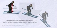 Your weight should generally be in the middle of the ski lengthways, which is over your toes not heels. Leaning forwards or backwards makes the ends of the skis drop so that you turn into the fall line, which is normally used to initiate manoeuvres.
