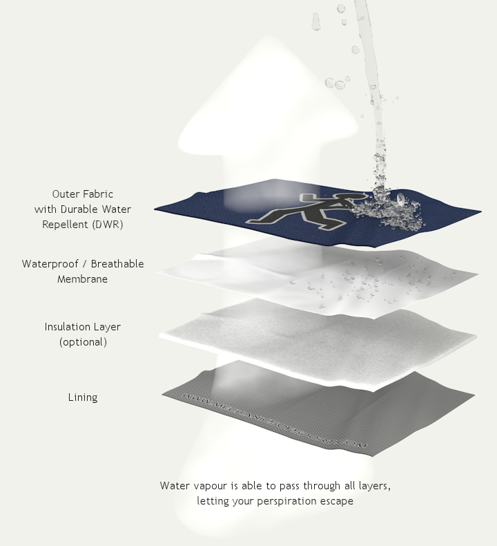 - A durable outer fabric layer coated with a durable water repellent (DWR). This layer is normally made of nylon or polyester and provides the durability of the garment. The coating repels water droplets so that they roll off the fabric, making it difficult for water, snow and dirt to penetrate the outer fabric.