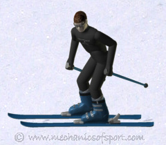 The animation shows the 3D skier speeding up and slowing down while sliding straight down the 3D piste. Then the camera angle changes and he leans forwards so that he goes forwards slightly, brings his weight back to the middle, to go sideways again, then leans back, to go backwards slightly, finishing up with his weight in the middle so that he is going sideways again.