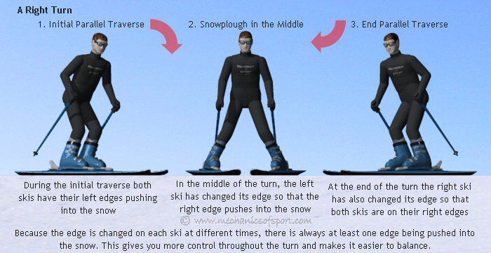 In the snowplough turn the inside edges are always pushing into the snow and they do not change, but in a stem turn we start with a parallel traverse and end with a parallel traverse in the other direction. When you traverse across a slope to the left with your skis parallel, the left edges on both of the skis push into the snow, but when you traverse to the right the right edges on both of the skis push into the snow. Therefore at some point during a turn each ski has to change the edge that is pushing into the snow. How we change the edges is another reason that the stem turn is the natural progression from the snowplough turn, and it is to do with the snowplough position that we use in the middle. As we change the skis from parallel to a snowplough shape, only the ski that will be on the outside of a turn changes the edge that is pushing into the snow, and as we bring the skis parallel again towards the end of a turn, only the inside ski changes its edge. This means that the skis change their edges at different times, and there is always at least one ski pushing its edge into the snow, acting as a brake and helping you keep control and your balance.