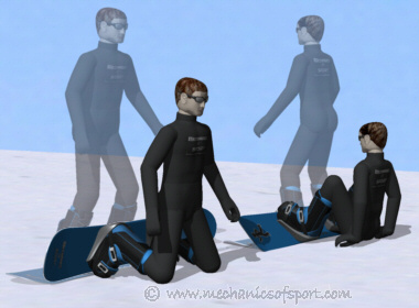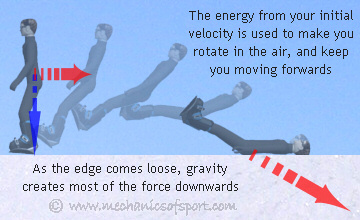 The flying edge catch happens when your initial sideways velocity is so fast that when the edge catches, the rotation it creates lifts the edge out of the snow. This makes you come spinning into the air, continuing to rotate until you hit the snow. This generally happens when you catch an edge with a sideways velocity of more than about 11km/h (7mph).