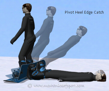 The Pivot Edge Catch happens when you are going a bit faster than the slow edge catch, and when the edge catches you are not so much sent off balance, but suddenly thrown forwards or backwards. This takes your body away from over the edge too quickly to recover by sitting or kneeling down, and instead the caught edge acts like a pivot throwing your body at the snow.