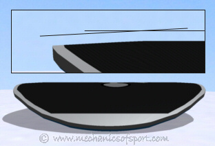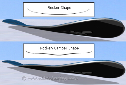 Often called a rocker. This is where the the traditional camber has been reversed, so that when the board is laid on a flat surface, the middle of the boards sits the lowest with the ends coming upwards. This shape makes it harder to catch an edge, as it's natural tendency is to push the edges up and away from the snow, which also makes snowboards easier to spin around. Because of this shape though, edge hold on harder snow is reduced considerably, which means that it is not so suitable for freeride boards. The shape can be modified to a rocker/camber shape though which naturally brings the ends of the boards off of the snow so that they don't catch, but has camber towards the tips so that they provide better edge hold when they are pushed on. As the negative camber concept is still quite new, it's not yet clear which shapes will become the most popular and quite what affect it will have on all the different types of snowboards. Negative camber is already commonly used on freestyle specific snowboards, although with shapes like the rocker/camber it might well start to influence other types of snowboard as well.