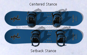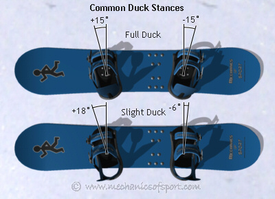 For freestyle the duck stance is very popular, this is where the front foot is angled forwards and the back foot is angled backwards. Although this might not be the most comfortable stance for some, it is good at allowing you to snowboard in either direction along the board, which is very handy for freestyle where snowboarding backwards (switch, fakie) is very important. When both feet are at the same angle (i.e. +15°/-15°) it is called a full duck, or mirrored stance, and when the back foot is not angled as much as the front it can be called a slight duck. The duck stance can also be used for beginners on a freestyle board with a centred stance, this makes the board the same to ride in either direction, which is good for anyone who initially can't decide if they are regular or goofy and needs to experiment.