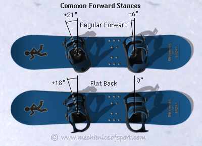 For general snowboarding, carving and off-piste snowboarding, a forward stance is good. This is where both bindings are angled forwards, with the front binding usually between +30 and +12 degrees and the back binding usually between +12 and 0 degrees. This stance is a comfortable stance, it lets you see where you are going well, and is also good for beginners. One place where it struggles though is riding switch, as it is harder to see where you are going, and puts your body in an uncomfortable position. This is why for freestylers a forward stance is generally not the stance of choice.