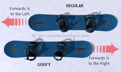 The first thing we need to work out our footedness. Since on a snowboard we stand sideways to the direction the board points, we either have to go to our left or to our right. Regular is where you ride left foot first (forwards is to your left), and goofy is where you ride with your right foot first (forwards is to your right). Some people know instinctively which way they should ride, for people who don't, there are several methods that can be used to try and work it out. Getting people to imagine they are surfing or skateboarding, and then say which way is forwards in their imagination generally works well. Another good method is to have your back foot as the foot you would kick a football with. Unfortunately none of the methods to work out if you are regular or goofy are as reliable as would be nice. Some people will even switch between regular and goofy several times before they decide which is best for them. If you take snowboard lessons, one thing the instructor will look for and check on is that you are riding in the direction that is best for you.