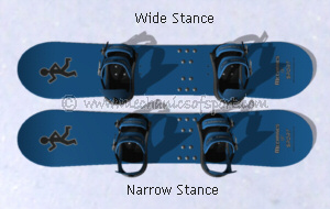 Next you need to decide how far apart you want to have your feet. As a general rule your stance width should be a little wider than your shoulders (or roughly 29% of your height for men, and 27% of your height for women). This might need adjusting though depending on what you want to do, and what you feel comfortable with. Freestylers will often have a wider stance to help them throw the snowboard around, and for more stability on landings. Freeriders often have a slightly narrower stance as it makes turning and piste riding easier. Freeriders also don't need to throw their weight along the board so much, so have no need for that extra stability along the board. If you haven't snowboarded before it's advised to start with the bindings just over shoulder width apart, and then adjust them from there if you feel you need to.